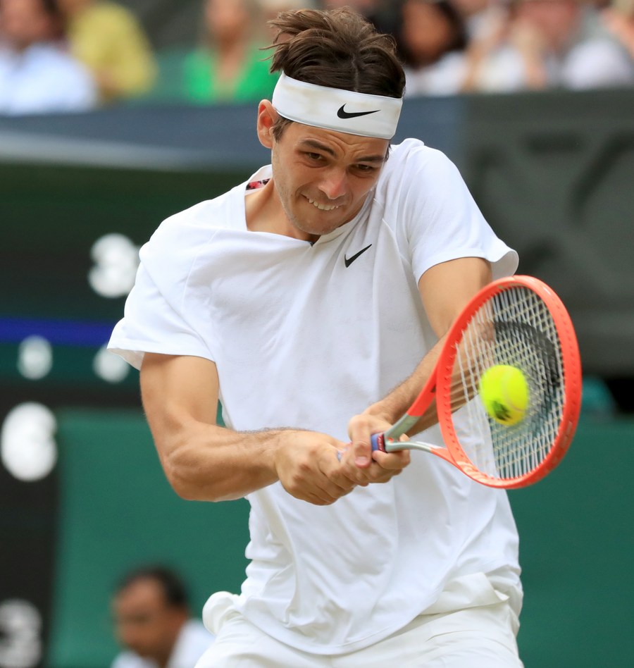 Taylor Fritz of the United States hits a return during the men's singles quarter-final match against Rafael Nadal of Spain at Wimbledon Tennis Championship in London, Britain, on July 6, 2022. (Xinhua/Li Ying)