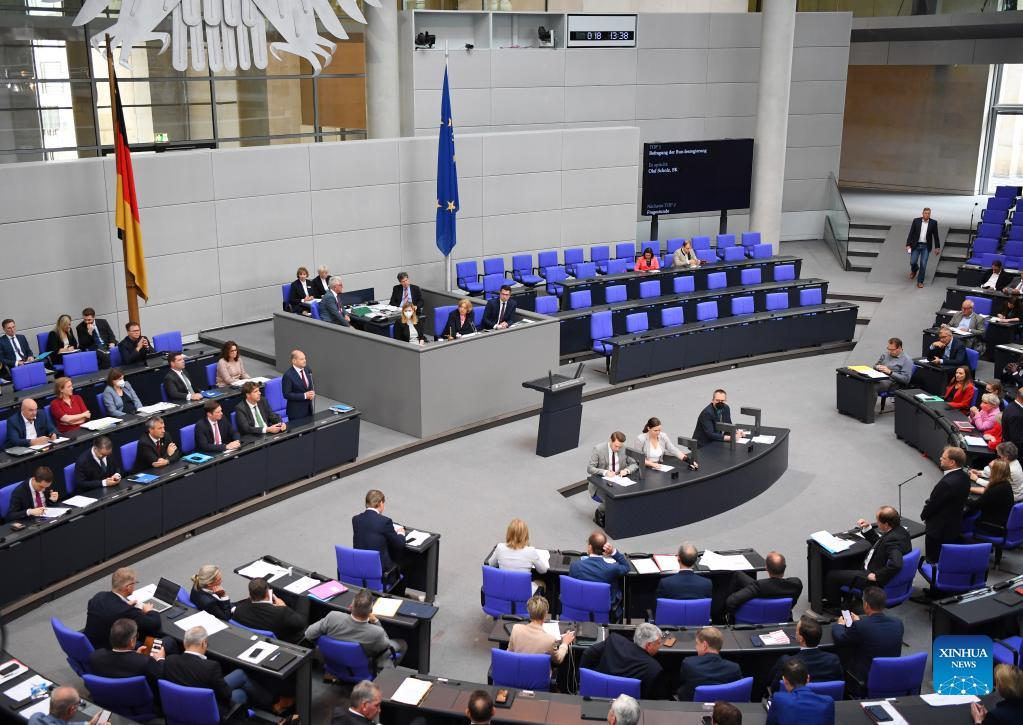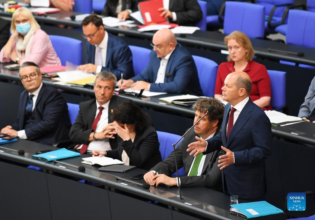 German Chancellor Olaf Scholz (1st R, front) attends a question session of the Bundestag in Berlin, capital of Germany, July 6, 2022. (Xinhua/Ren Pengfei)