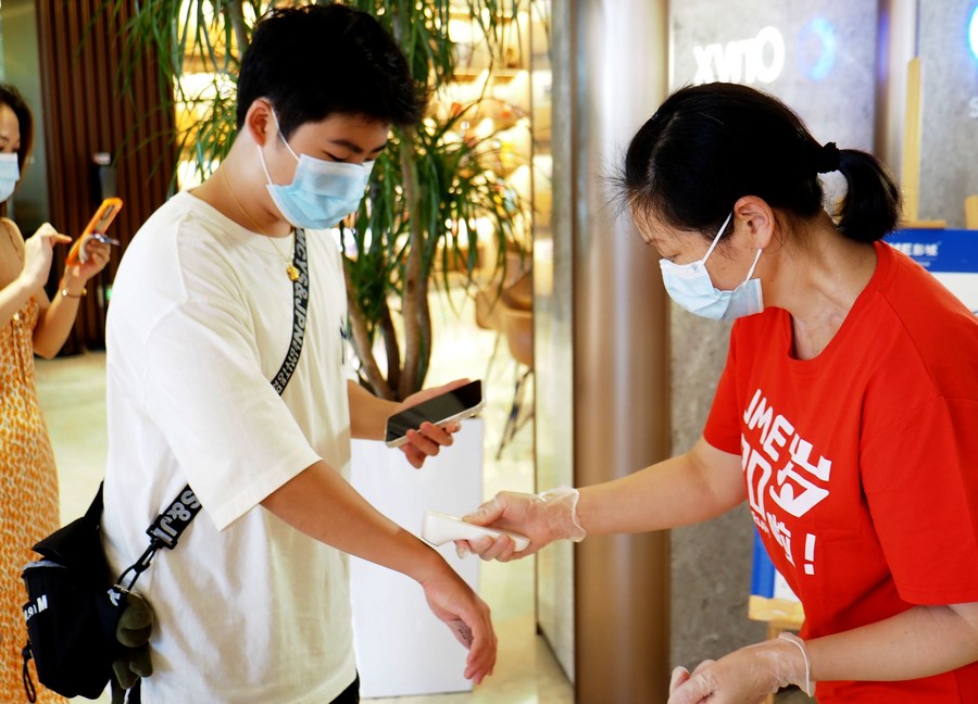Photo taken on July 8, 2022 shows a cinema staff member taking the body temperature of a moviegoer in Shanghai. Over 100 movie theaters in Shanghai resumed operation on Friday after about four months of epidemic-led closure. (Xinhua/Ren Long)