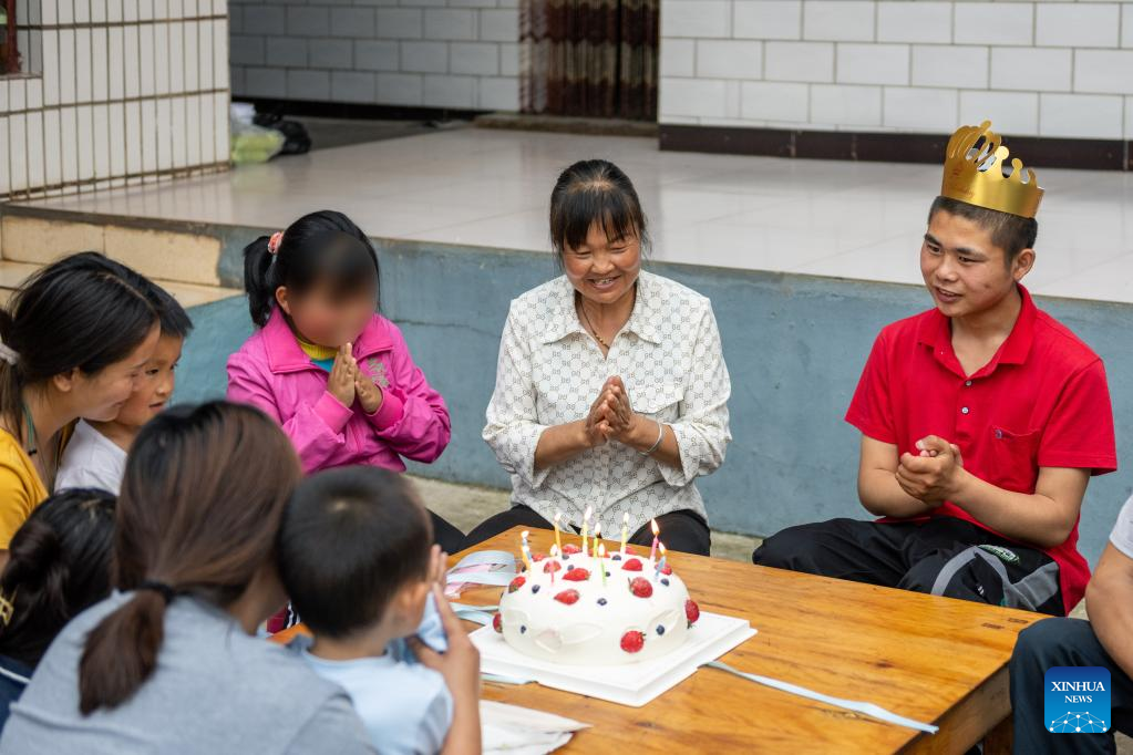 Cao Liqiong's family celebrates the 19th birthday for Abin (pseudonym) in Wangjiatan Village of Caopu Township in Anning, southwest China's Yunnan Province, May 20, 2022. (Xinhua/Cao Mengyao)