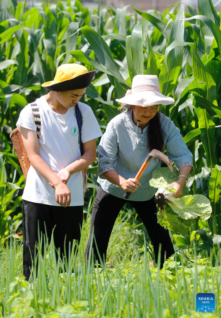 Cao Liqiong (R) and Abin (pseudonym) harvest vegetables in a field in Wangjiatan Village of Caopu Township in Anning, southwest China's Yunnan Province, July 6, 2022. (Xinhua/Zhou Lei)