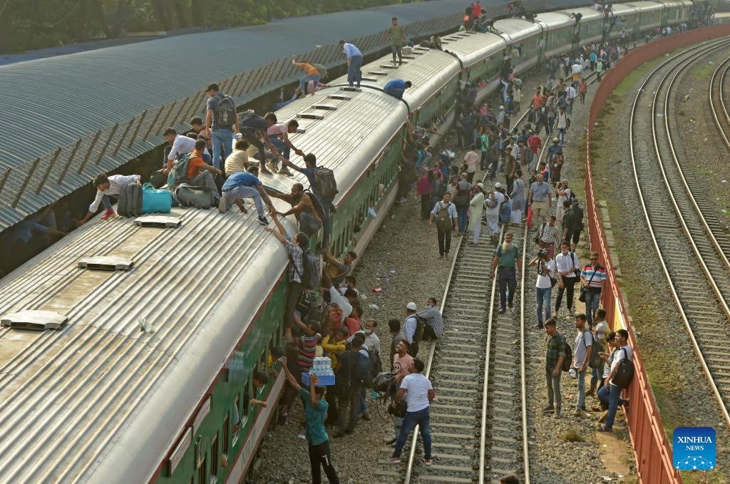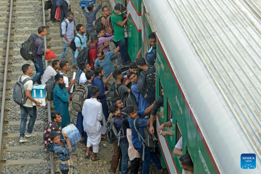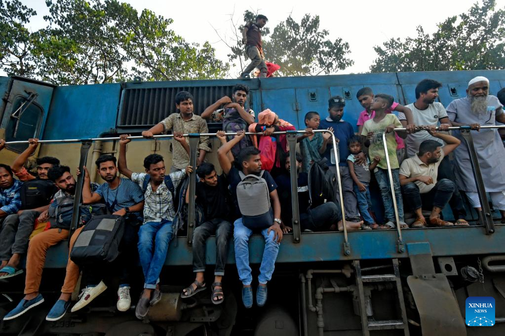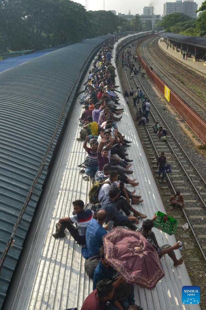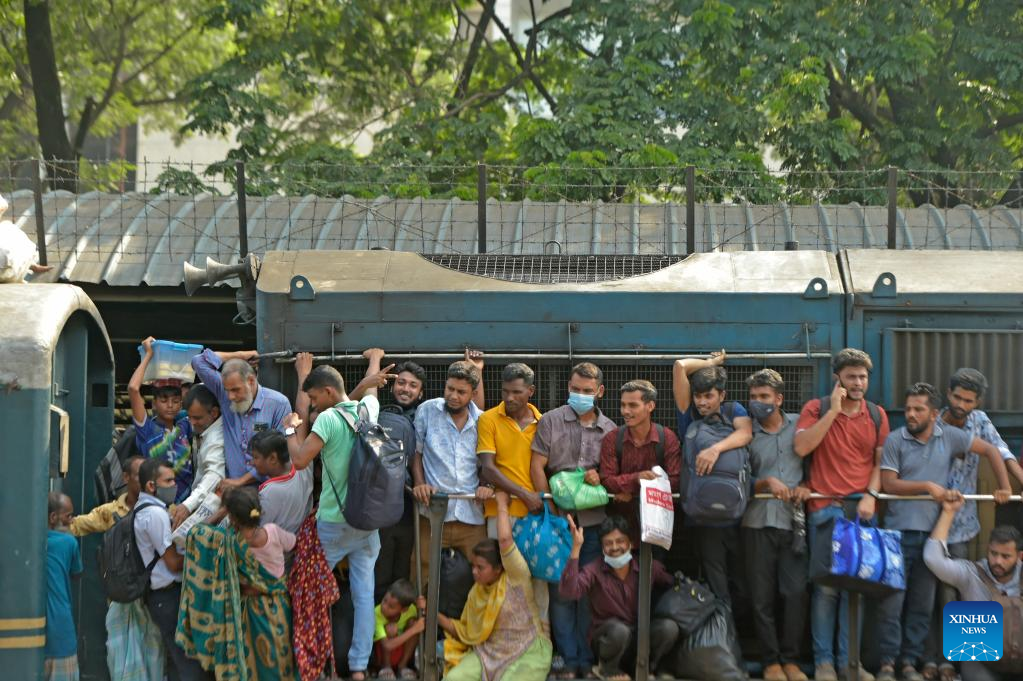 People cling to train carriages as they head to their homes to celebrate Eid al-Adha festival, from Dhaka, Bangladesh, July 7, 2022. As Eid al-Adha festival approaches, many people from Bangladesh capital Dhaka have streamed out of the city to join the festival with their kith and kin in village homes. (Xinhua)