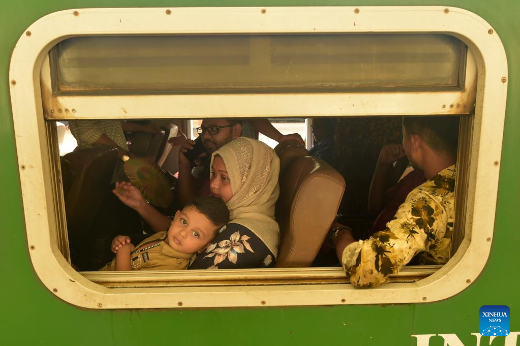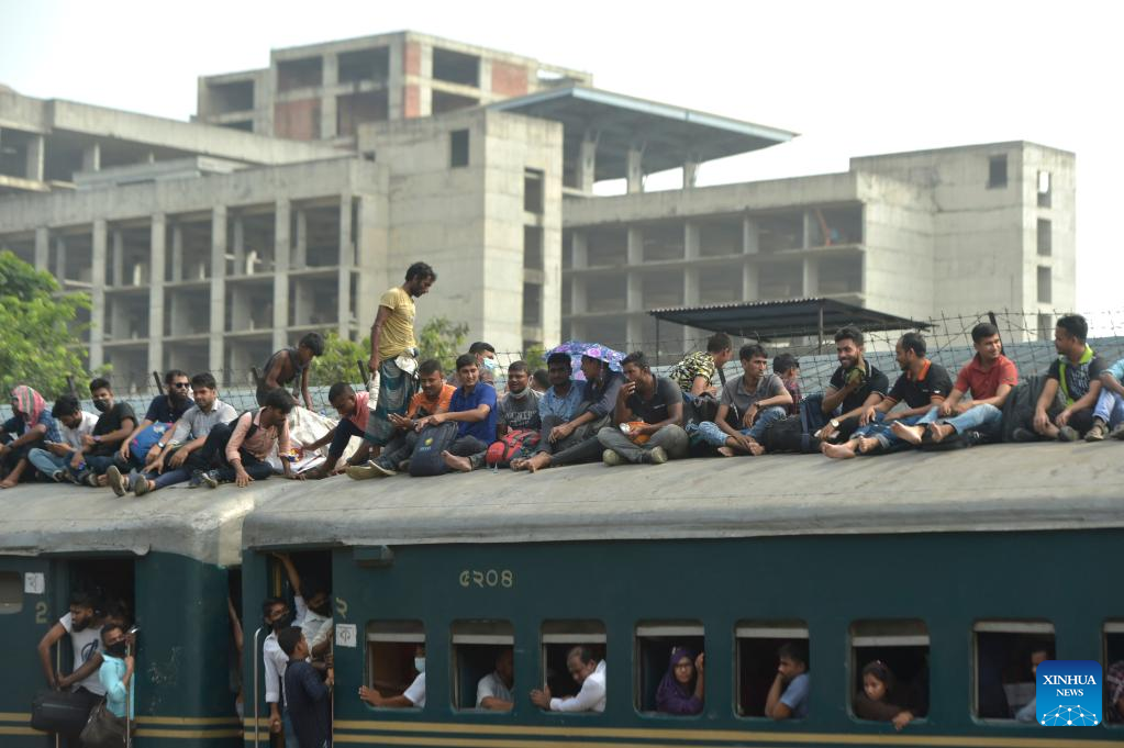 Travelers sitting on a train leave a station in Dhaka, Bangladesh, July 7, 2022. As Eid al-Adha festival approaches, many people from Bangladesh capital Dhaka have streamed out of the city to join the festival with their kith and kin in village homes. (Xinhua)
