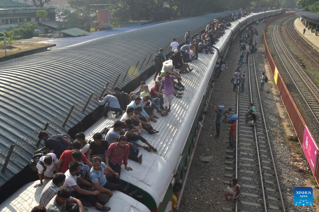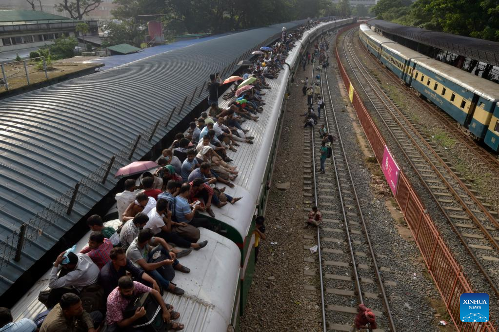 Travelers sitting on the roof of a train leave a station in Dhaka, Bangladesh, July 7, 2022. As Eid al-Adha festival approaches, many people from Bangladesh capital Dhaka have streamed out of the city to join the festival with their kith and kin in village homes. (Xinhua)