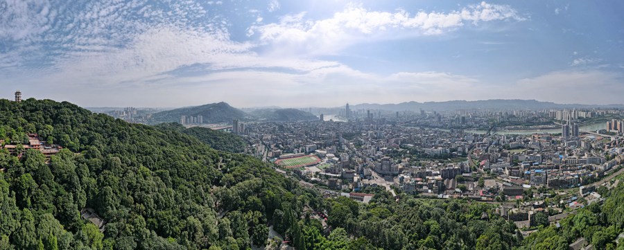 Aerial panorama photo taken on June 30, 2022 shows Mount Cuiping in Yibin, southwest China's Sichuan Province. (Xinhua/Xu Bingjie)
