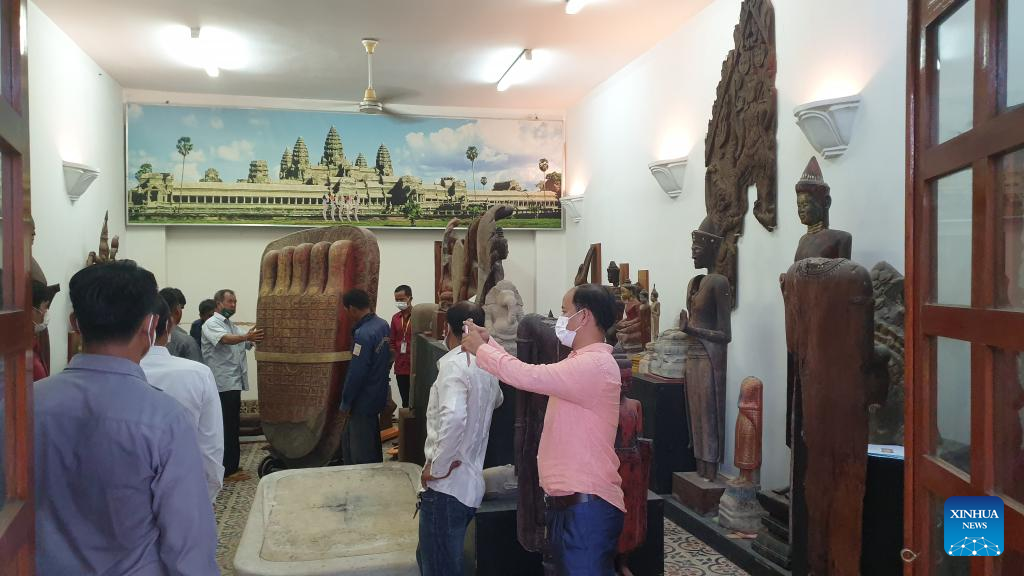 PHNOM PENH, July 8 (Xinhua) -- A restored sandstone Buddha foot statue and six ancient wooden Buddha statues are on display at the Preah Norodom Sihanouk-Angkor Museum in Cambodia's northwestern Siem Reap province, the Apsara National Authority (ANA) said in a news release on Friday.