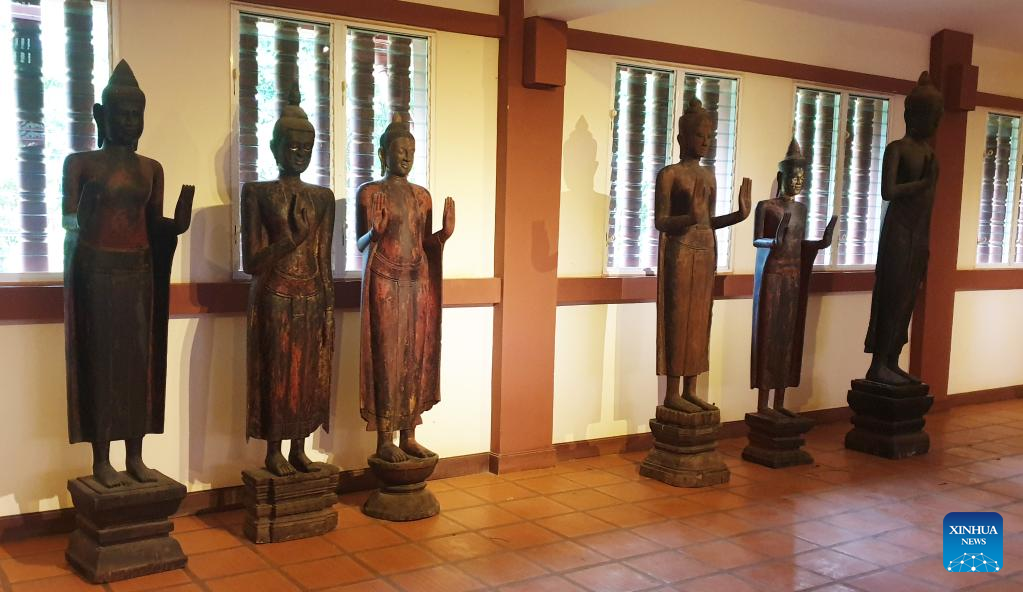 Photo taken on May 10, 2022 shows ancient wooden Buddha statues at the Preah Norodom Sihanouk-Angkor Museum in Siem Reap province, Cambodia. A restored sandstone Buddha foot statue and six ancient wooden Buddha statues are on display at the Preah Norodom Sihanouk-Angkor Museum in Cambodia's northwestern Siem Reap province, the Apsara National Authority (ANA) said in a news release on Friday. (ANA/Handout via Xinhua)