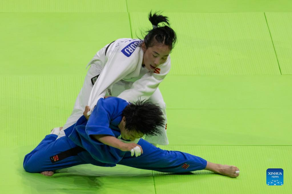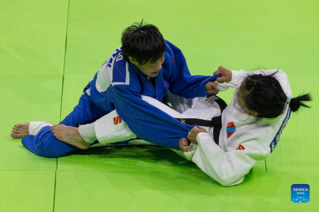 China's Guo Zongying (L) and Mongolia's Baasankhuu Bavuudorj compete during the Women's 48kg bronze match at the IJF Grand Slam Hungary 2022 in Budapest, Hungary on July 8, 2022. (Photo by Attila Volgyi/Xinhua)
