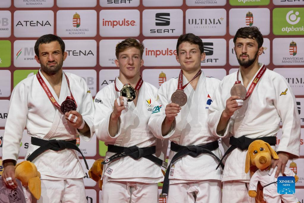 Silver medalist Georgia's Lukhumi Chkhvimiani (1st L) and gold medalist Belgium's Jorre Verstraeten (2nd L) pose with bronze medalists France's Romain Valadier Picard (2nd R) and Georgia's Temur Nozadze during the awards ceremony for the Men's 60kg event at the IJF Grand Slam Hungary 2022 in Budapest, Hungary on July 8, 2022. (Photo by Attila Volgyi/Xinhua)