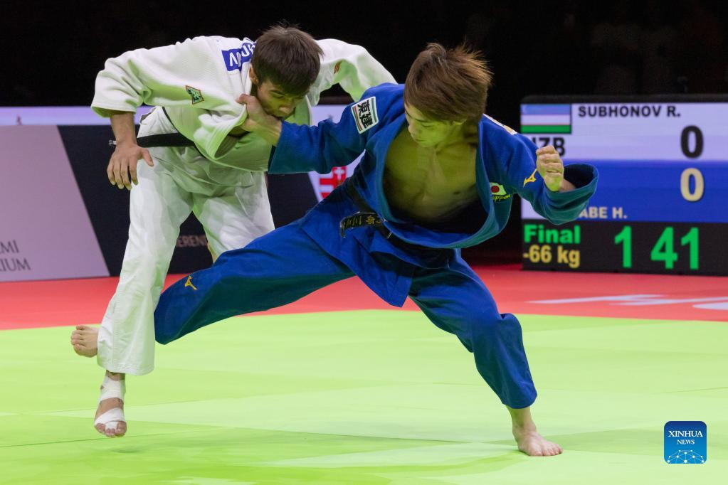 Japan's Abe Hifumi (R) and Uzbekistan's Rakhimjon Subhonov compete during the Men's 66kg final at the IJF Grand Slam Hungary 2022 in Budapest, Hungary on July 8, 2022. (Photo by Attila Volgyi/Xinhua)