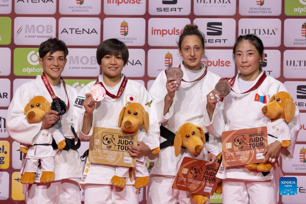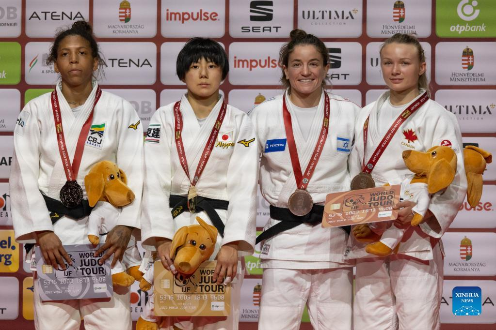 Silver medalist Brazil's Rafaela Silva (1st L), gold medalist Japan's Funakubo Haruka (2nd L) pose with bronze medalists Israel's Timna Nelson Levy (2nd R) and Canada's Jessica Klimkait during the awards ceremony for the Women's 57kg event at the IJF Grand Slam Hungary 2022 in Budapest, Hungary on July 8, 2022. (Photo by Attila Volgyi/Xinhua)