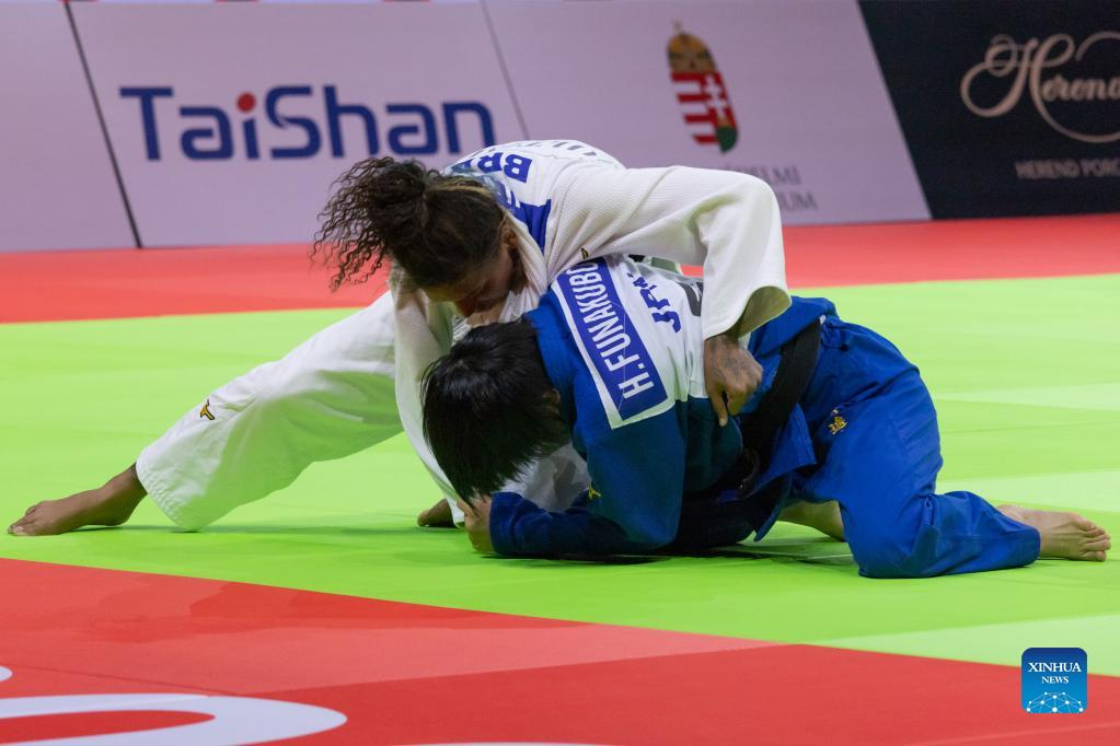 Japan's Funakubo Haruka (top) and Brazil's Rafaela Silva compete during the Women's 57kg final at the IJF Grand Slam Hungary 2022 in Budapest, Hungary on July 8, 2022. (Photo by Attila Volgyi/Xinhua)