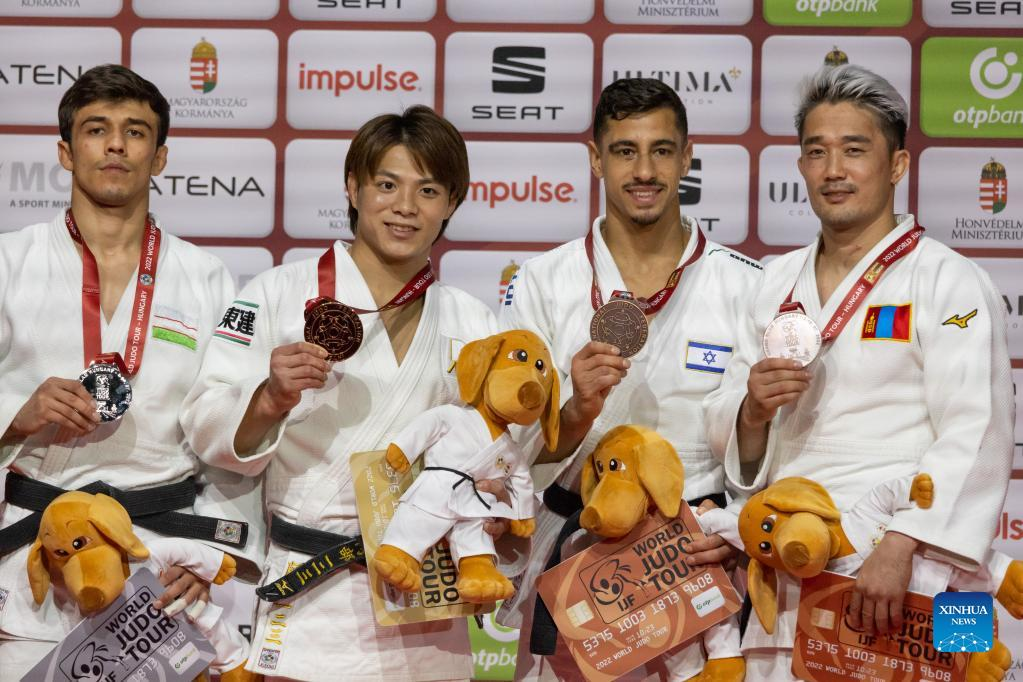 Silver medalist Uzbekistan's Rakhimjon Subhonov (1st L), gold medalist Japan's Abe Hifumi (2nd L) pose with bronze medalists Israel's Tal Flicker (2nd R) and Mongolia's Kherlen Ganbold during the awards ceremony for the Men's 66kg event at the IJF Grand Slam Hungary 2022 in Budapest, Hungary on July 8, 2022. (Photo by Attila Volgyi/Xinhua)