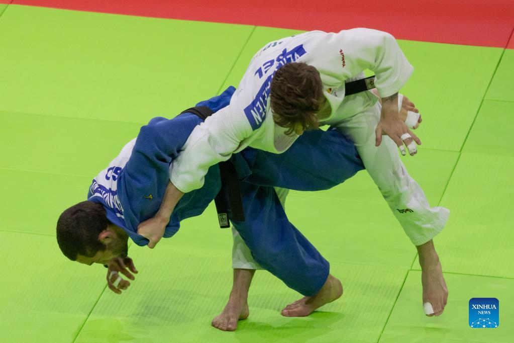 Belgium's Jorre Verstraeten (top) and Georgia's Lukhumi Chkhvimiani compete during the Men's 60kg final at the IJF Grand Slam Hungary 2022 in Budapest, Hungary on July 8, 2022. (Photo by Attila Volgyi/Xinhua)