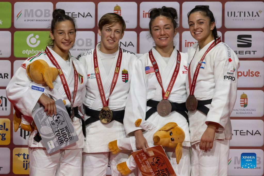 Silver medalist Italy's Giulia Carna (1st L), gold medalist Hungary's Reka Rupp (2nd L) pose with bronze medalists USA's Angelica Delgado (2nd R) and Israel's Gefen Primo during the awards ceremony for the Women's 52kg event at the IJF Grand Slam Hungary 2022 in Budapest, Hungary on July 8, 2022. (Photo by Attila Volgyi/Xinhua)