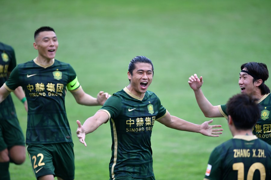 Zhang Yuning (C) of Beijing Guoan celebrates after scoring during a 2022 season Chinese Football Association Super League (CSL) match between Beijing Guoan and Shenzhen FC in Meizhou, south China's Guangdong Province, June 21, 2022. (Xinhua/Chen Zhenhai)