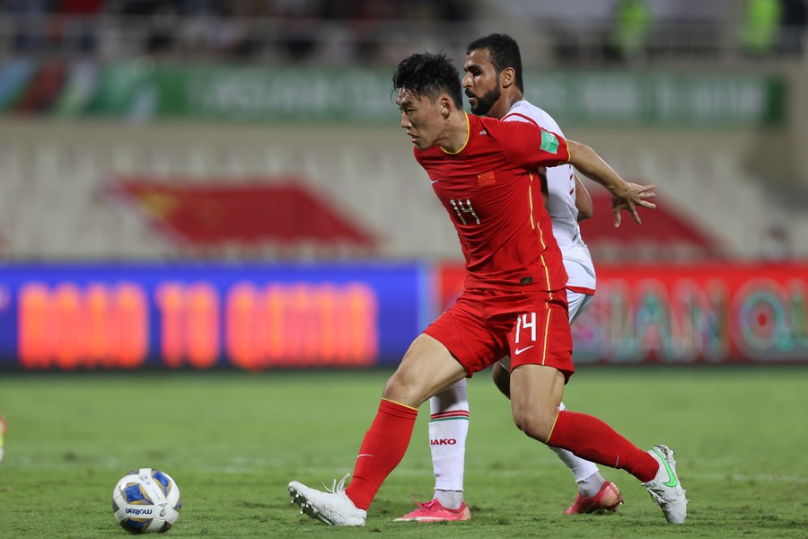 Zhu Chenjie (L) of China competes during a Group B match between China and Oman of 2022 FIFA World Cup Asian qualifiers in Sharjah, the United Arab Emirates, on Nov. 11, 2021. (Xinhua)