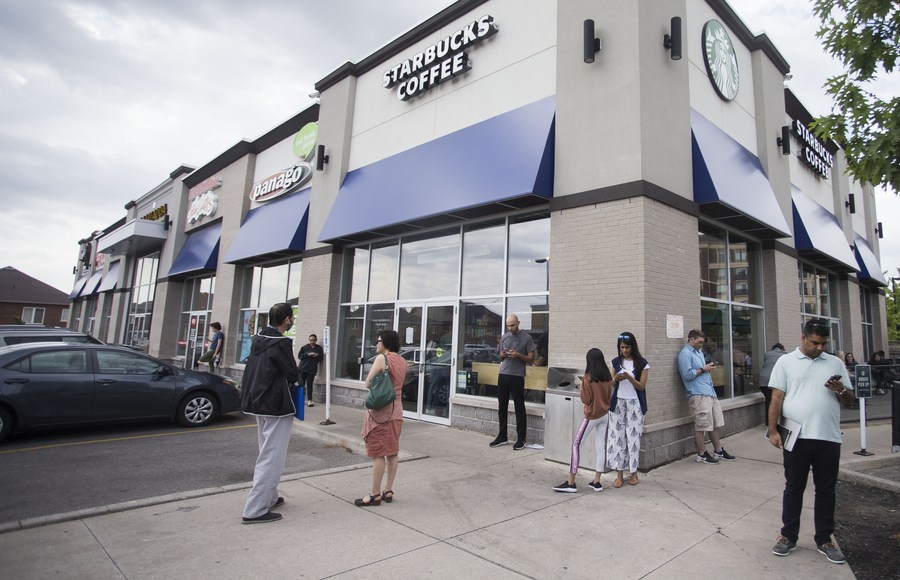 People use public Wi-Fi outside a Starbucks cafe in Mississauga, Ontario, Canada, July 8, 2022. (Photo by Zou Zheng/Xinhua)