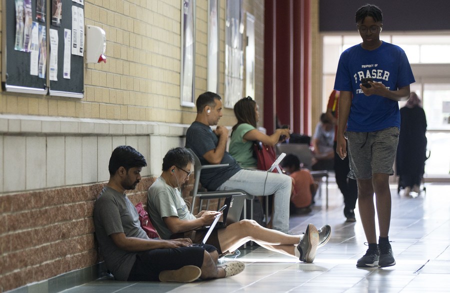 People use public Wi-Fi at a community center in Mississauga, Ontario, Canada, July 8, 2022. (Photo by Zou Zheng/Xinhua)