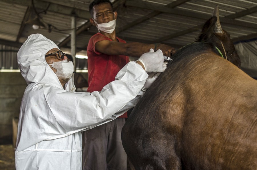 An animal care worker wearing protective suits gives a vaccine dose to a cow during nationwide livestock vaccination program against the foot-and-mouth disease (FMD) in Bandung, West Java, Indonesia, June 27, 2022.(Photo by Septianjar/Xinhua)