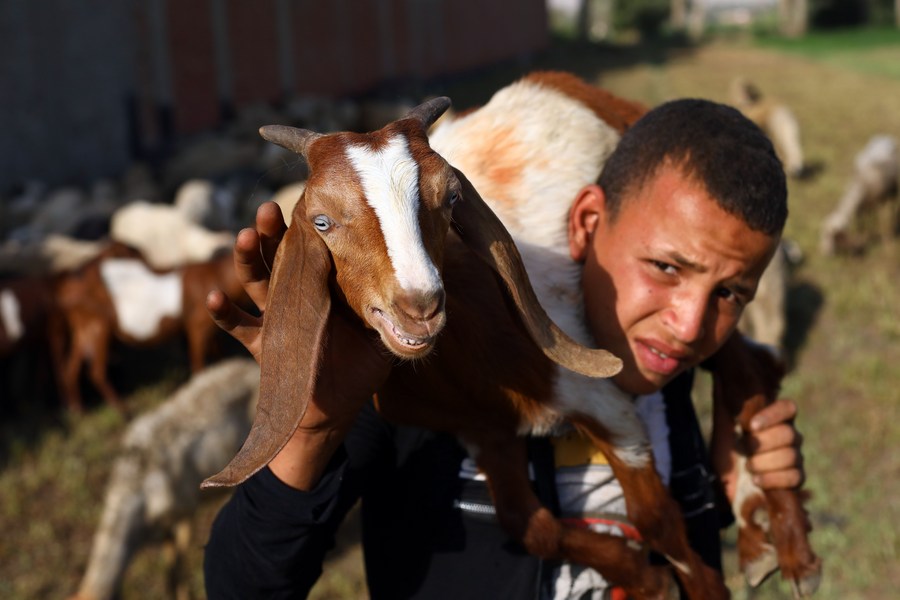 A farmer shoulders a goat during herding livestock on the outskirts of Giza, Egypt, on June 26, 2022. Local farmers are fatting their livestock in preparation for the upcoming Eid al-Adha. (Xinhua/Ahmed Gomaa)