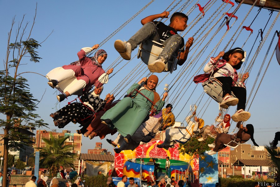 People enjoy themselves at a park during Eid al-Adha holiday in Qalyubia province, Egypt, on July 23, 2021. (Xinhua/Ahmed Gomaa)
