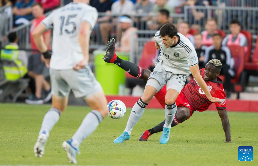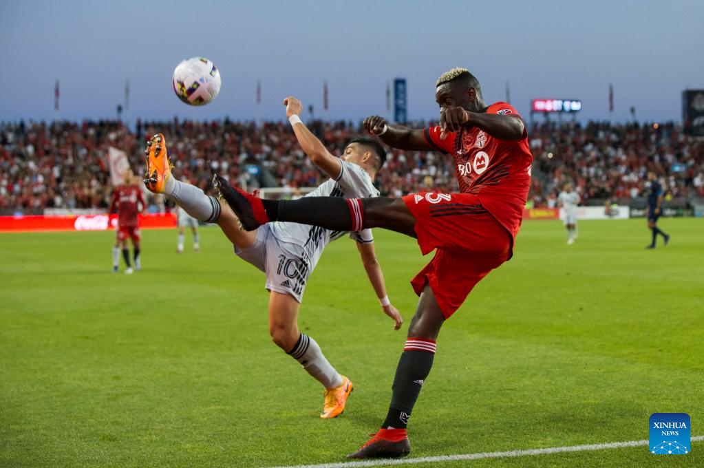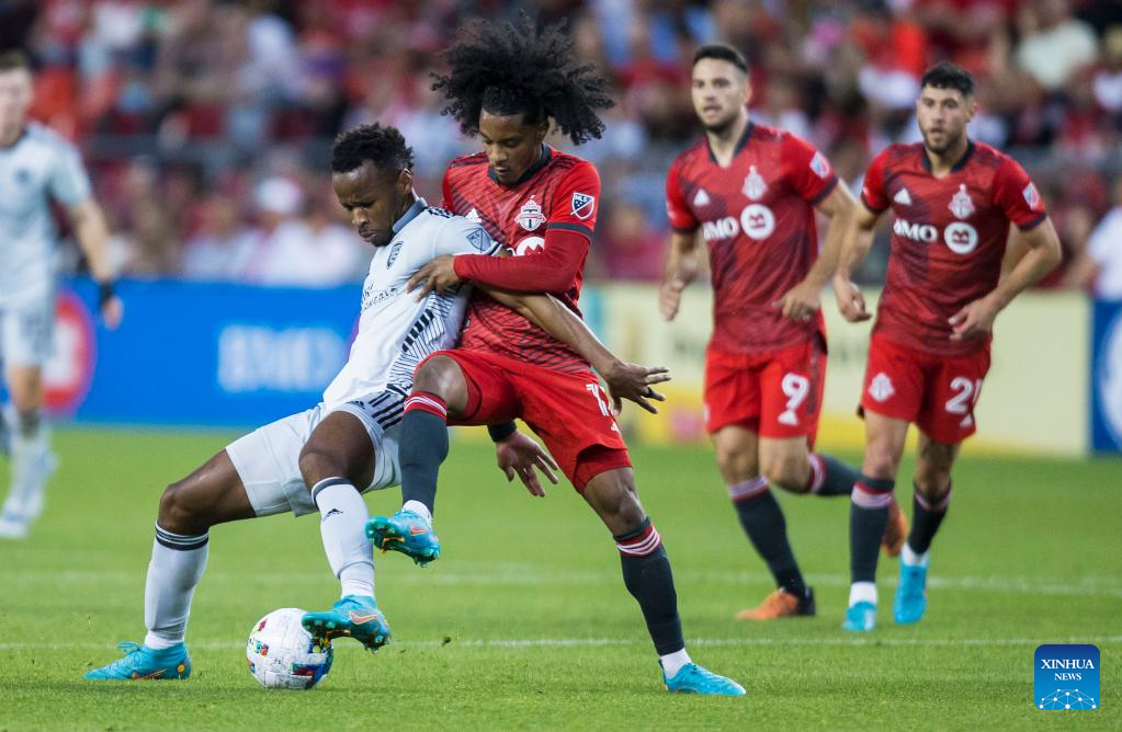Chris Mavinga (R) of Toronto FC vies with Cristian Espinoza of San Jose Earthquakes during their 2022 Major League Soccer(MLS) match at BMO Field in Toronto, Canada, on July 9, 2022. (Photo by Zou Zheng/Xinhua)
