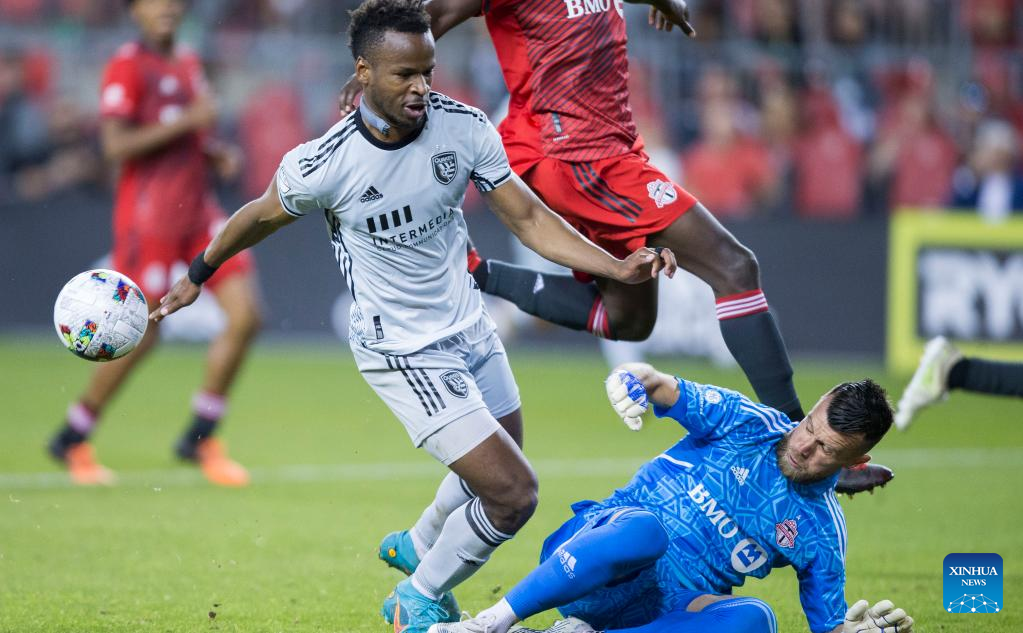 Goalkeeper Quentin Westberg (R) of Toronto FC makes a save during the 2022 Major League Soccer (MLS) match between Toronto FC and San Jose Earthquakes at BMO Field in Toronto, Canada, on July 9, 2022. (Photo by Zou Zheng/Xinhua)