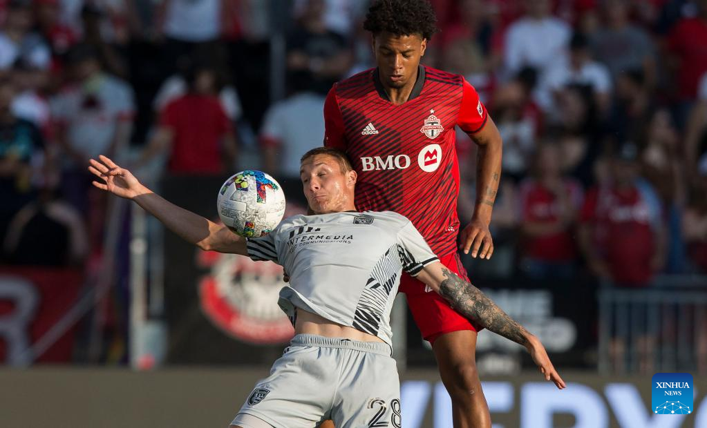 Deandre Kerr (R) of Toronto FC vies with Marcos Lopez of San Jose Earthquakes during their 2022 Major League Soccer (MLS) match at BMO Field in Toronto, Canada, on July 9, 2022. (Photo by Zou Zheng/Xinhua)