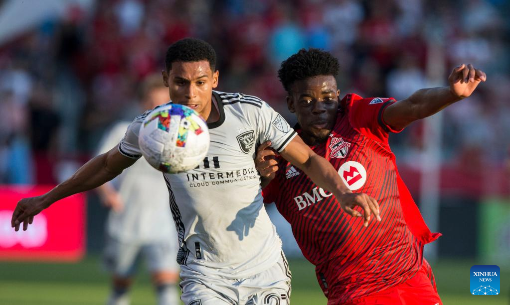 Chris Mavinga (R) of Toronto FC vies with Nathan Raphael Pelae Cardoso of San Jose Earthquakes during their 2022 Major League Soccer (MLS) match at BMO Field in Toronto, Canada, on July 9, 2022. (Photo by Zou Zheng/Xinhua)