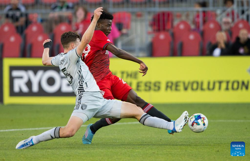 Deandre Kerr (back) of Toronto FC shoots during the 2022 Major League Soccer (MLS) match between Toronto FC and San Jose Earthquakes at BMO Field in Toronto, Canada, on July 9, 2022. (Photo by Zou Zheng/Xinhua)