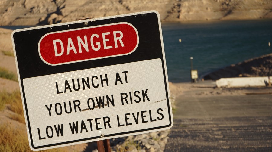 Photo taken on July 5, 2022 shows a sign warning people about the danger to launch boats due to low water levels near Echo Bay, Lake Mead, Nevada, the United States. (Photo by Zeng Hui/Xinhua)