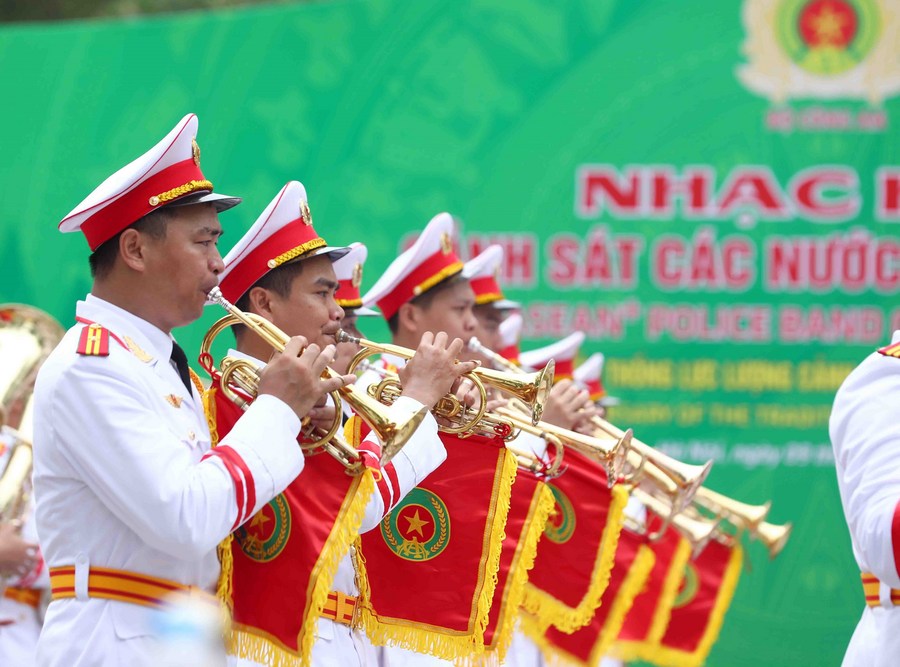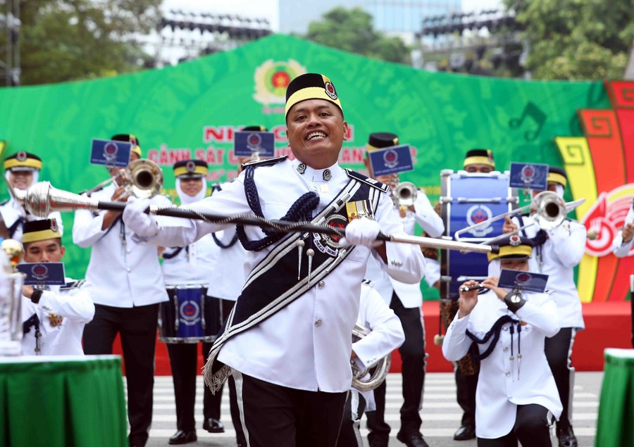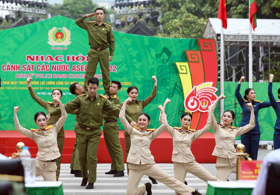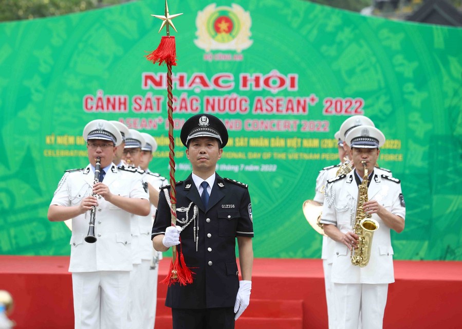 The Vietnamese police music troupe performs during the opening ceremony of the ASEAN Plus 2022 Police Music Festival in Hanoi, Vietnam, on July 9, 2022. (VNA/Handout via Xinhua) ■