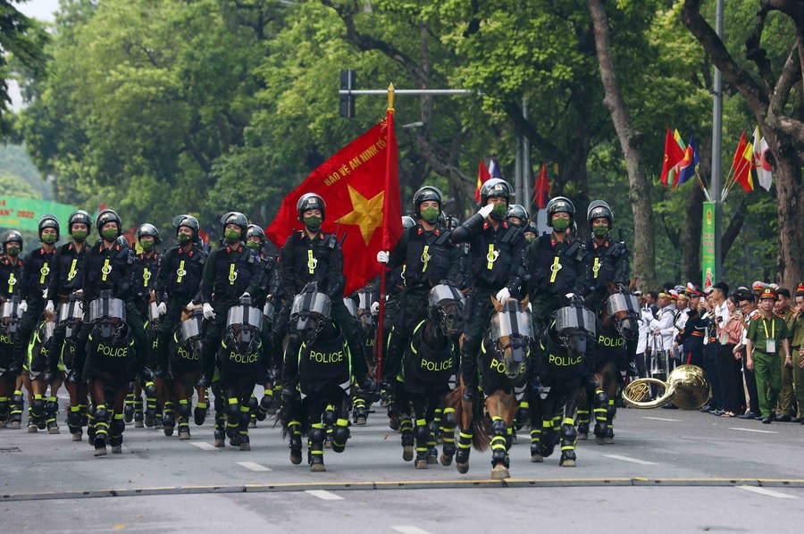 The Vietnamese mounted police force parade before the opening ceremony of the ASEAN Plus 2022 Police Music Festival in Hanoi, Vietnam, on July 9, 2022.(VNA/Handout via Xinhua)
