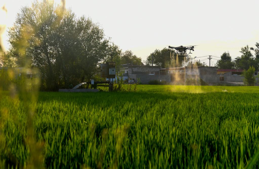 Photo taken on July 4, 2022 shows a drone carrying out agricultural work in a rice paddy in Dujiazhuang Village, Sandaoba Township, Midong District, Urumqi, northwest China's Xinjiang Uygur Autonomous Region.