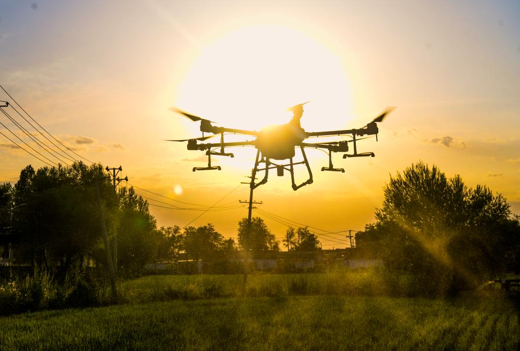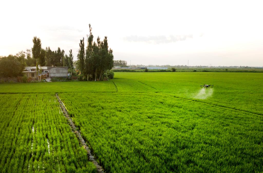 Aerial photo taken on July 4, 2022 shows a drone carrying out agricultural work in a rice paddy in Dujiazhuang Village, Sandaoba Township, Midong District, Urumqi, northwest China's Xinjiang Uygur Autonomous Region.