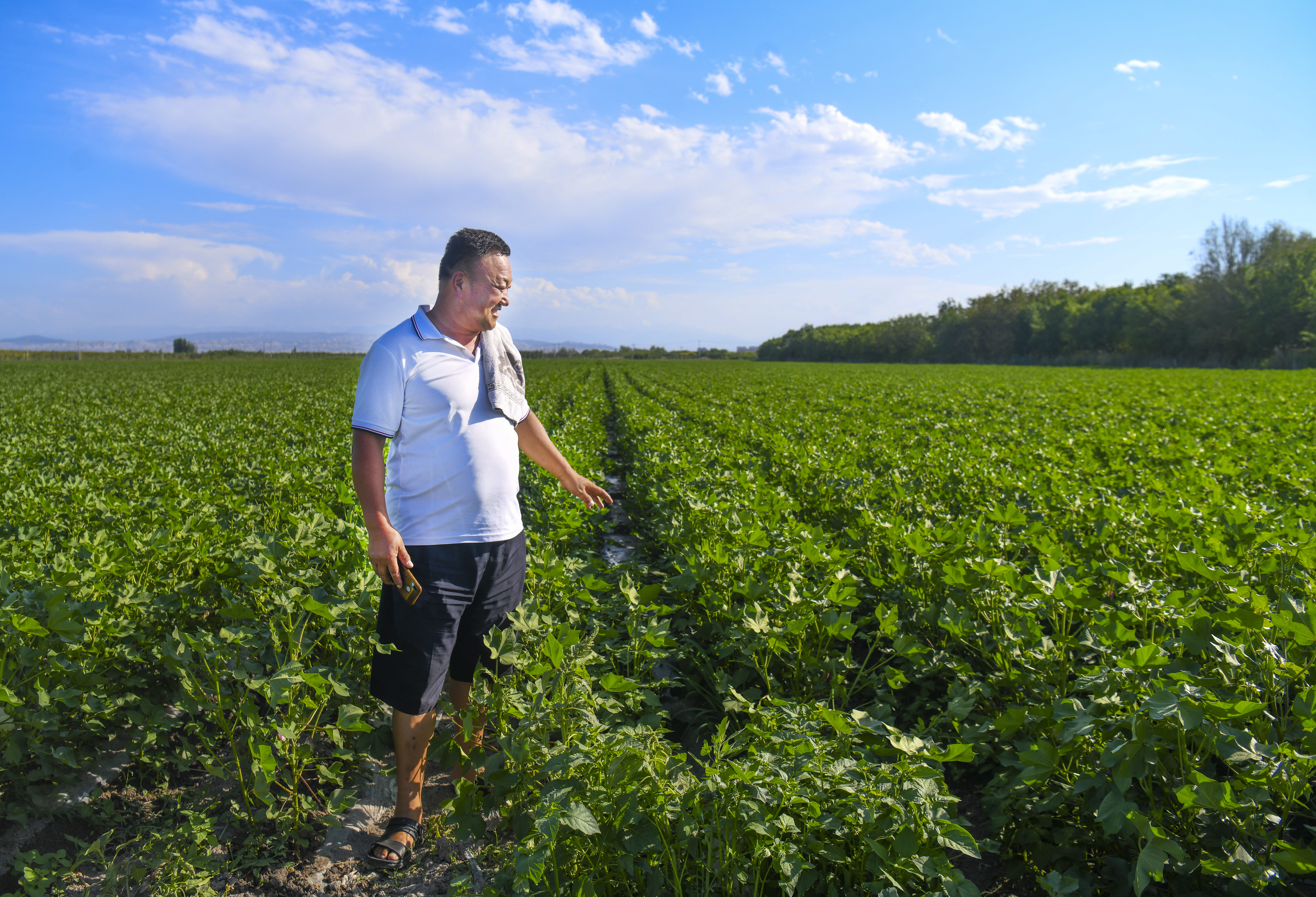A farmer checks the growth of cotton in a cotton field in Manas County, northwest China's Xinjiang Uygur Autonomous Region, June 30, 2022.