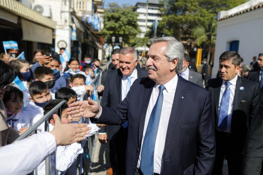 Photo provided by the Telam News Agency of Argentina shows President Alberto Fernandez arriving at the main event for the celebration of the 206th anniversary of the Declaration of Independence, in Tucuman Province, Argentina, on July 9, 2022. (Xinhua/Presidency/TELAM)