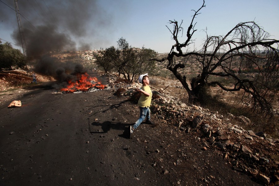 Clashes break out between Palestinian protesters and Israeli soldiers after a protest against the expanding of Jewish settlements in Kufr Qadoom village near the West Bank city of Nablus, on Oct. 27, 2017. (Xinhua/Nidal Eshtayeh)