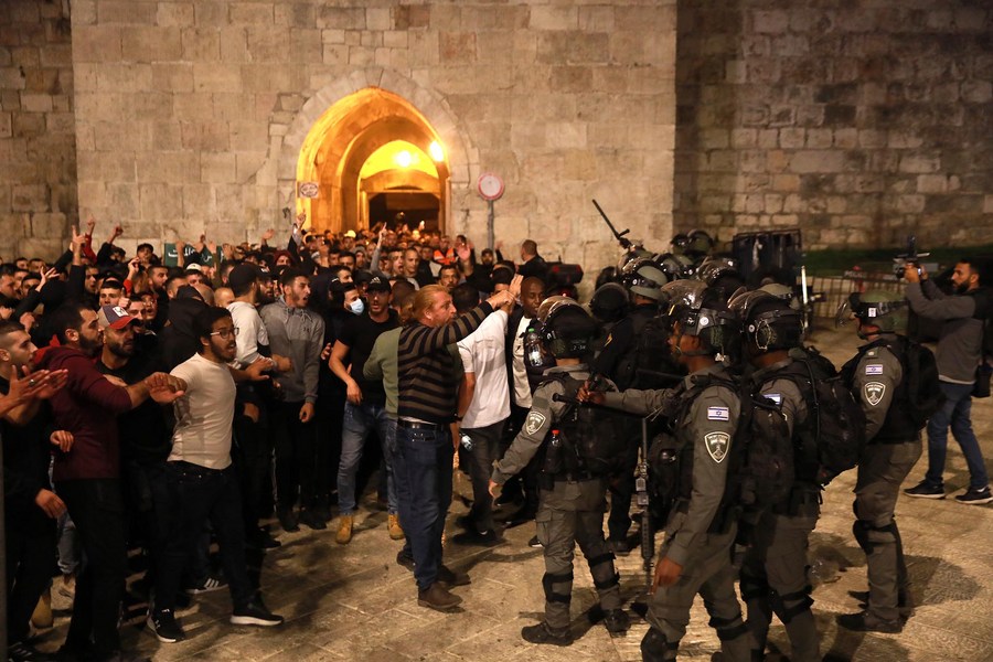 Israeli police patrol during clashes with Palestinians in Jerusalem on May 16, 2022. (Photo by Muammar Awad/Xinhua)