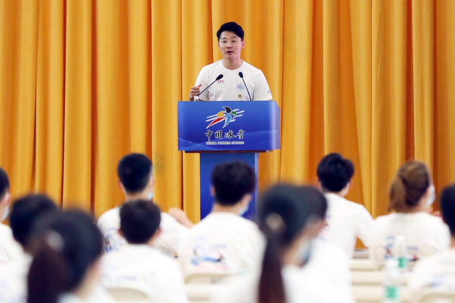 Ren Ziwei shares his Beijing 2022 experience at the opening ceremony for China's 2022 short track speed skating national training camp in Beijing, July 11, 2022. (Xinhua/Luo Yuan)