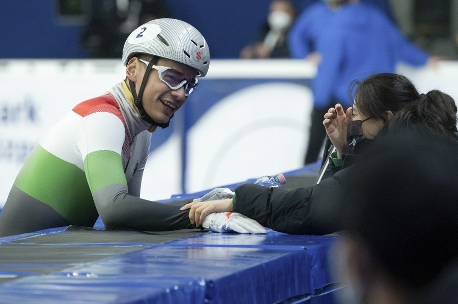 Liu Shaolin Sandor (L) of Hungary celebrates victory with coach Zhang Jing after the men's 500m final at the ISU World Cup Short Track Speed Skating series in Debrecen, Hungary, Nov. 20, 2021. (Photo by Attila Volgyi/Xinhua)
