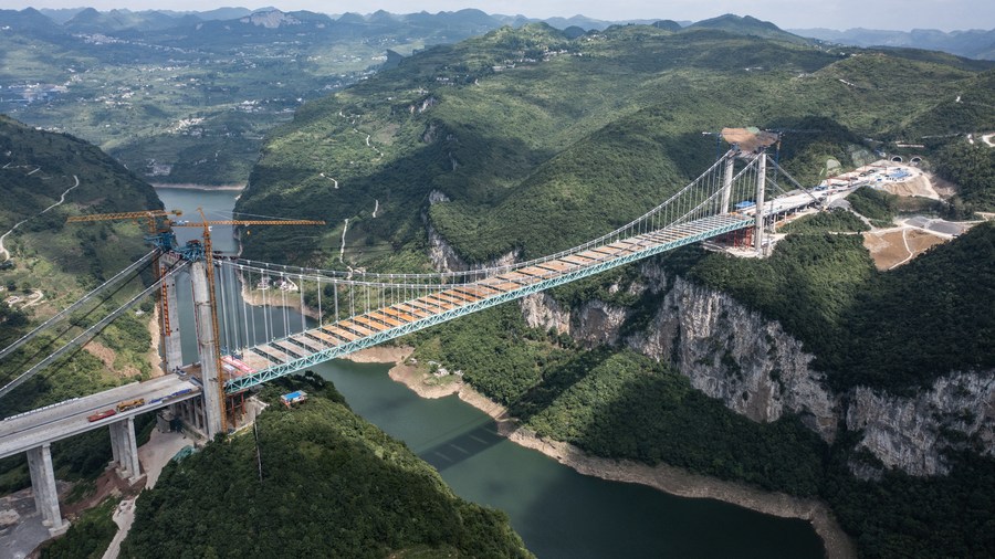 Aerial photo taken on July 10, 2022 shows the two main sections of the Jinfeng Wujiang River Grand Bridge being joined together in southwest China's Guizhou Province. Spanning 1,473.5 meters, the bridge is a key project along the Guiyang-Jinsha-Gulin expressway. (Xinhua/Tao Liang)