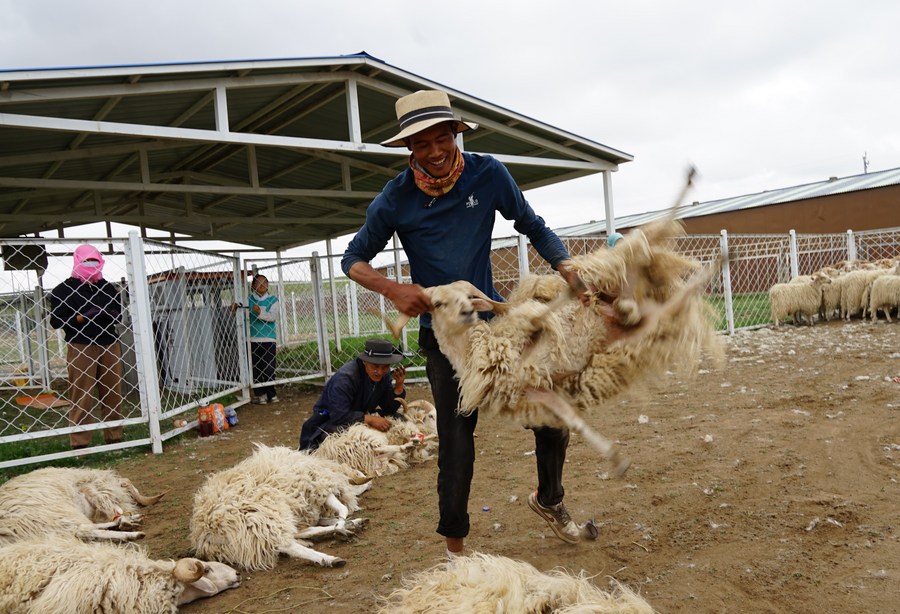 A herder gets ready to shear a Tibetan sheep in Cihandawa Village of Hainan Tibetan Autonomous Prefecture, northwest China's Qinghai Province, July 9, 2022. Cihandawa Village has taken steps to increase the scale of animal husbandry in the area, making it into a well-managed and marketed industry. (Xinhua/Wang Daqian)