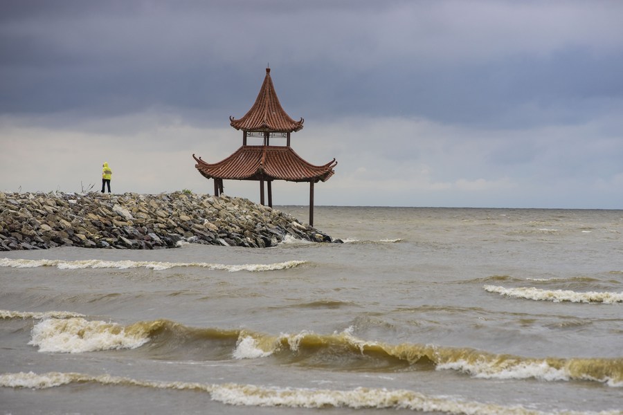 A tourist takes photos by the Xingkai Lake at the Xingkai Lake National Nature Reserve in Jixi, northeast China's Heilongjiang Province, July 9, 2022. (Xinhua/Zhang Tao)