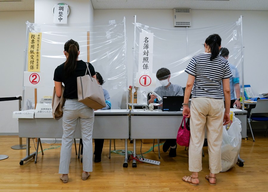 Voters arrive to cast their ballots at a polling station for Japan's House of Councilors election in Tokyo, Japan, July 10, 2022. Japan's ruling bloc of the Liberal Democratic Party (LDP) and Komeito is set to secure a majority of seats contested in the House of Councilors election on Sunday, maintaining its majority in the upper chamber, Kyodo News exit polls showed. For this year's election, a total of 125 seats were contested. (Photo by Christopher Jue/Xinhua)