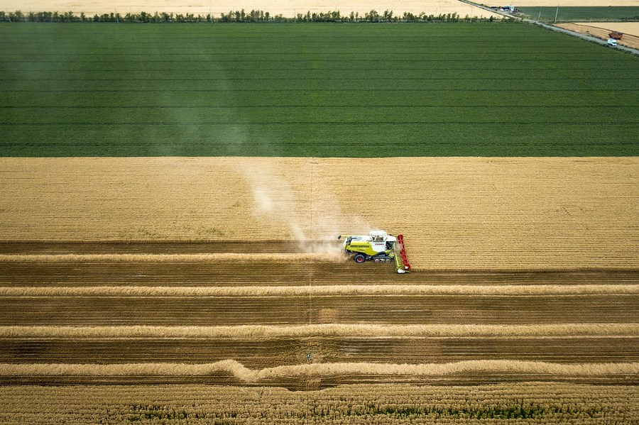 Aerial photo taken on July 7, 2022 shows a combine harvester reaping wheat in a field in Qitai County, Changji Hui Autonomous Prefecture, northwest China's Xinjiang Uygur Autonomous Region. (Xinhua/Zhang Xiaocheng)