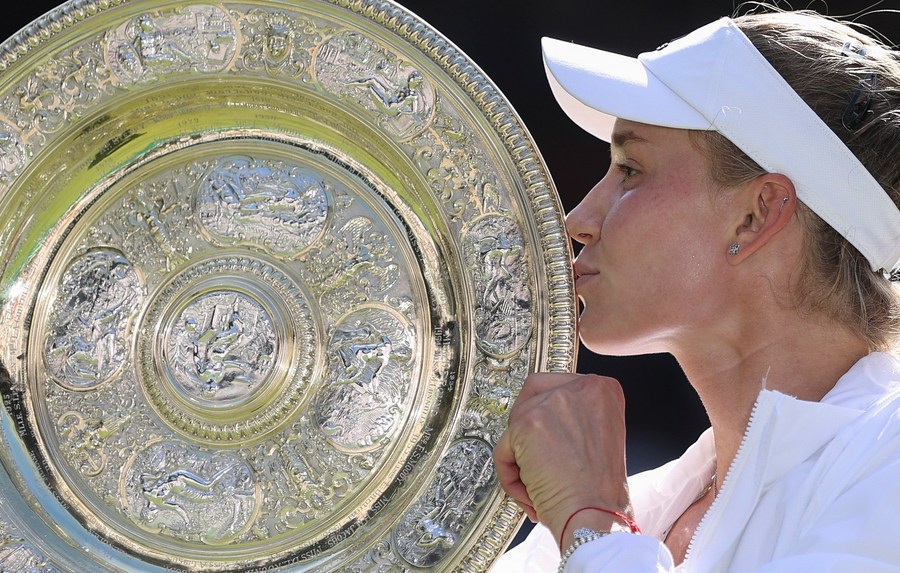 Elena Rybakina of Kazakhstan poses with the trophy after winning the women's singles final against Ons Jabeur of Tunisia at Wimbledon Tennis Championship in London, Britain, July 9, 2022. (Xinhua/Han Yan)