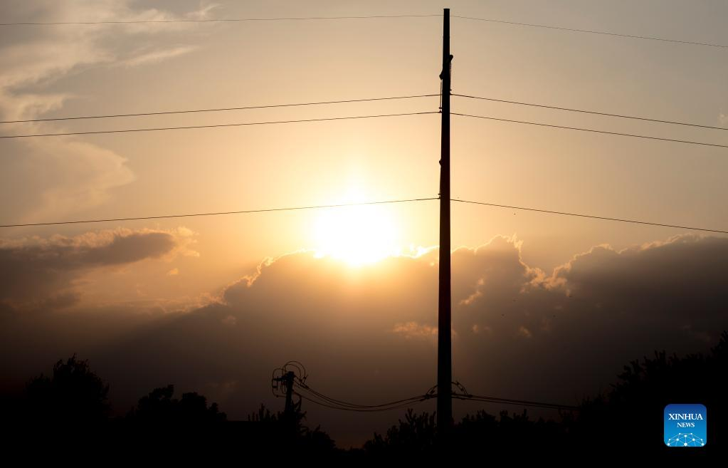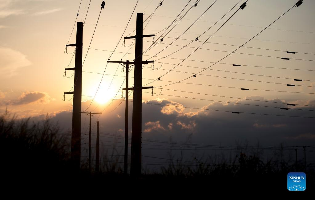The sun sets behind power transmission lines in Texas, the United States on July 11, 2022. The Electric Reliability Council of Texas (ERCOT) on Monday asked residents and businesses to reduce their power use as the heat index exceeded 100 degrees Fahrenheit in about half of the south central U.S. state. This heat wave began more than a week ago and is still going strong, challenging the state's power grid. The near-record temperatures in much of Texas have forced various outdoor events to be either delayed or canceled over safety concerns. (Photo by Nick Wagner/Xinhua)