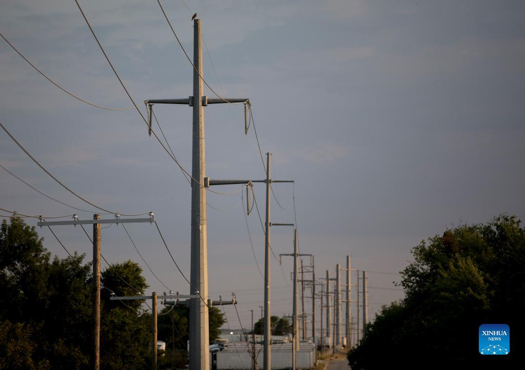 Photo taken on July 11, 2022 shows power transmission lines along a road in Texas, the United States. The Electric Reliability Council of Texas (ERCOT) on Monday asked residents and businesses to reduce their power use as the heat index exceeded 100 degrees Fahrenheit in about half of the south central U.S. state. This heat wave began more than a week ago and is still going strong, challenging the state's power grid. The near-record temperatures in much of Texas have forced various outdoor events to be either delayed or canceled over safety concerns. (Photo by Nick Wagner/Xinhua)